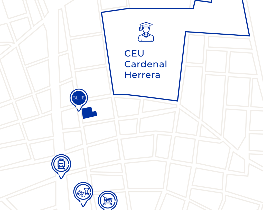 The Blue Residence se encuentra en el centro de Alfara del Patriarca, a pocos pasos de la Universidad CEU Cardenal Herrera y con todos los servicios necesarios a la vuelta de la esquina